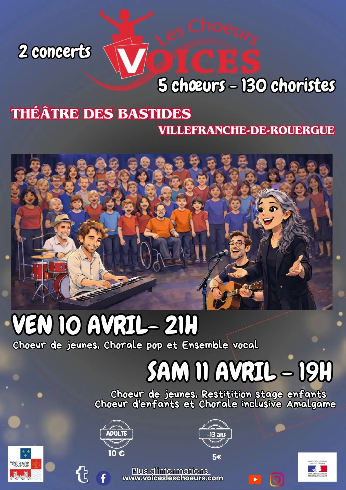 Comme chaque année l’association VOICES Les Chœurs organise son gala au théâtre des Bastides de Villefranche de Rouergue. Les 5 chœurs permanents de l’association comprenant 130 choristes se produiront sur scène lors de 2 concerts.