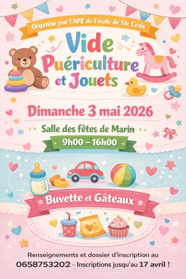 L’Association des Parents d’Élèves de l’école Célestin Rossignol de Sainte-Croix organise un vide « puériculture et jouets » à la salle des fêtes de Marin. Venez nombreux !